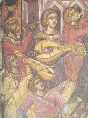 ![]() Ζουρνάς, λύρα(;), λαγούτο. Τοιχογραφία: Εμπαιγμός (λεπτομέρεια), 16ου αι. Μ. Βαρλαάμ, Καθολικό, Μετέωρα. |